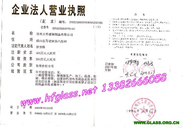 證書(shū)介紹 徐州大華玻璃制品有限公司 營(yíng)業(yè)執(zhí)照 徐州大華玻璃制品有限公司(徐州大華玻璃瓶廠)www.hfglass.net是中國(guó)最大的玻璃瓶(廣口瓶)生產(chǎn)基地及出口基地,熱線(xiàn)0516-85382638工藝先進(jìn)技術(shù)力量雄厚,,能生產(chǎn)各種規(guī)格型號(hào)的玻璃瓶,玻璃制品,玻璃罐glassbottle glassjar 按國(guó)家輕工部及企業(yè)標(biāo)準(zhǔn)生產(chǎn)品質(zhì)保證!公司多次被評(píng)為“AAA級(jí)信用企業(yè)”、“全國(guó)大二型鄉(xiāng)鎮(zhèn)企業(yè)”、“重合同守信用企業(yè)”公司通過(guò)ISO9001質(zhì)量體系及SGS,FDA,以及歐盟LFGB認(rèn)證,產(chǎn)品出口至日本、美國(guó)、俄羅斯、加拿大、法國(guó),英國(guó),意大利,韓國(guó)、澳大利亞等40多個(gè)國(guó)家地區(qū),贏得國(guó)內(nèi)外客戶(hù)的青睞。公司產(chǎn)品主要有:玻璃瓶、玻璃罐,玻璃瓶子,酒瓶、洋酒瓶,香水瓶、醬菜瓶、罐頭瓶、飲料瓶、蜂蜜瓶、咖啡瓶、玻璃燭臺(tái),果酒瓶,保健酒瓶,葡萄酒瓶,威士忌酒瓶,果汁瓶,腐乳瓶,果醬瓶,醬醋瓶,麻油瓶,調(diào)味瓶,蜂蜜瓶,保健瓶,罐頭瓶,醫(yī)藥瓶,胡椒粉瓶,烤花瓶,蒙砂瓶,玻璃奶瓶,燕窩瓶,枇杷膏瓶,金銀花露瓶,菌苗組瓶,輸液瓶,農(nóng)藥瓶等90多個(gè)系列2000多個(gè)品種,并能為客戶(hù)來(lái)樣烤花、印字,蒙砂LOGO等深加工。公司擁有配套瓶蓋廠生產(chǎn)各種規(guī)格型號(hào)的馬口鐵瓶蓋及塑料瓶蓋,以及實(shí)力雄厚的模具生產(chǎn)公司,可以在最短的時(shí)間為客戶(hù)定制,訂做高品質(zhì)的模具。新產(chǎn)品開(kāi)發(fā)7-10天出產(chǎn)品, 公司擁有成熟的物流方式及進(jìn)出口權(quán),可為客戶(hù)代辦托運(yùn)、以及報(bào)關(guān)報(bào)檢業(yè)務(wù)。大華宗旨: 質(zhì)量第一、客戶(hù)第一、誠(chéng)信第一 .
