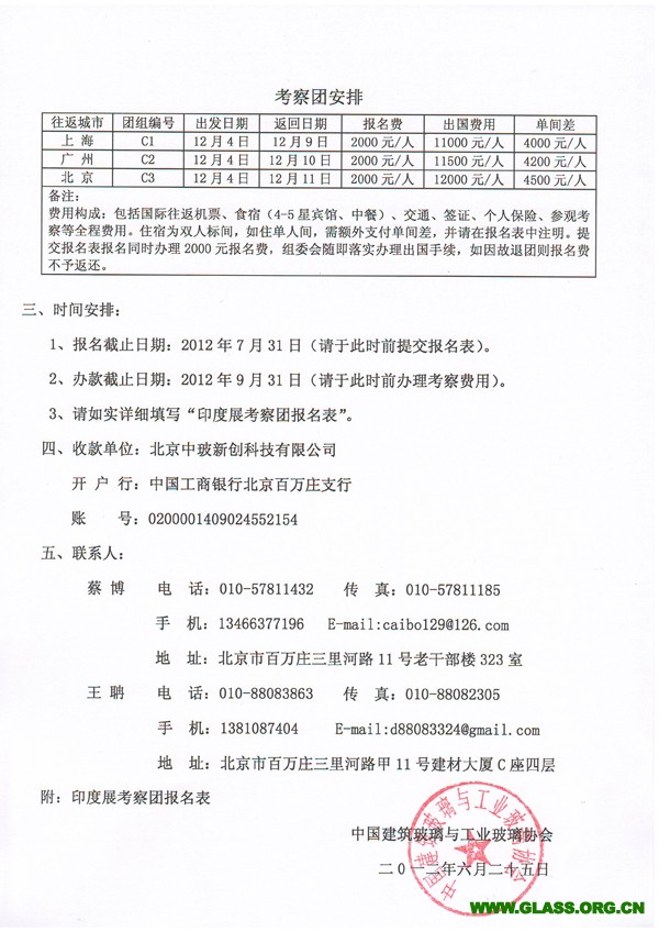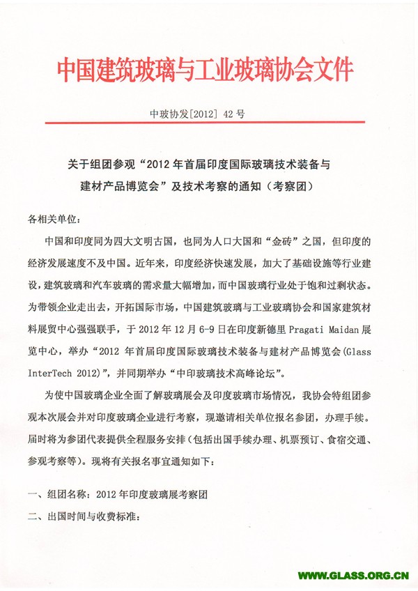 關(guān)于組團(tuán)參加“2012年首屆印度國(guó)際玻璃技術(shù)裝備與建材產(chǎn)品博覽會(huì)”的通知(展商團(tuán)/考察團(tuán))