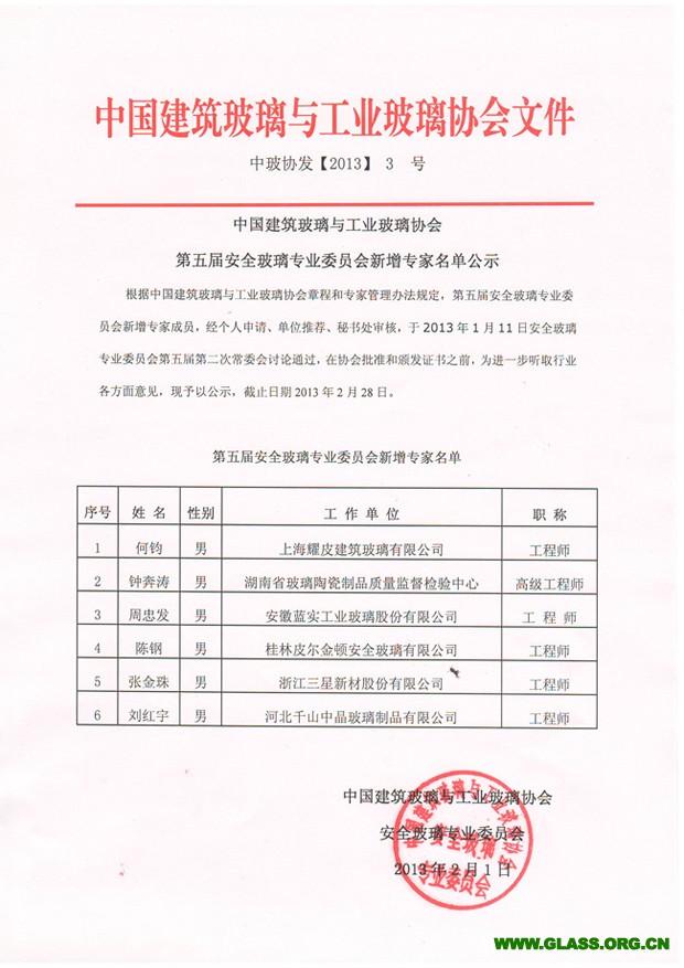 第六屆安全玻璃專業(yè)委員會(huì)新增專家名單公示